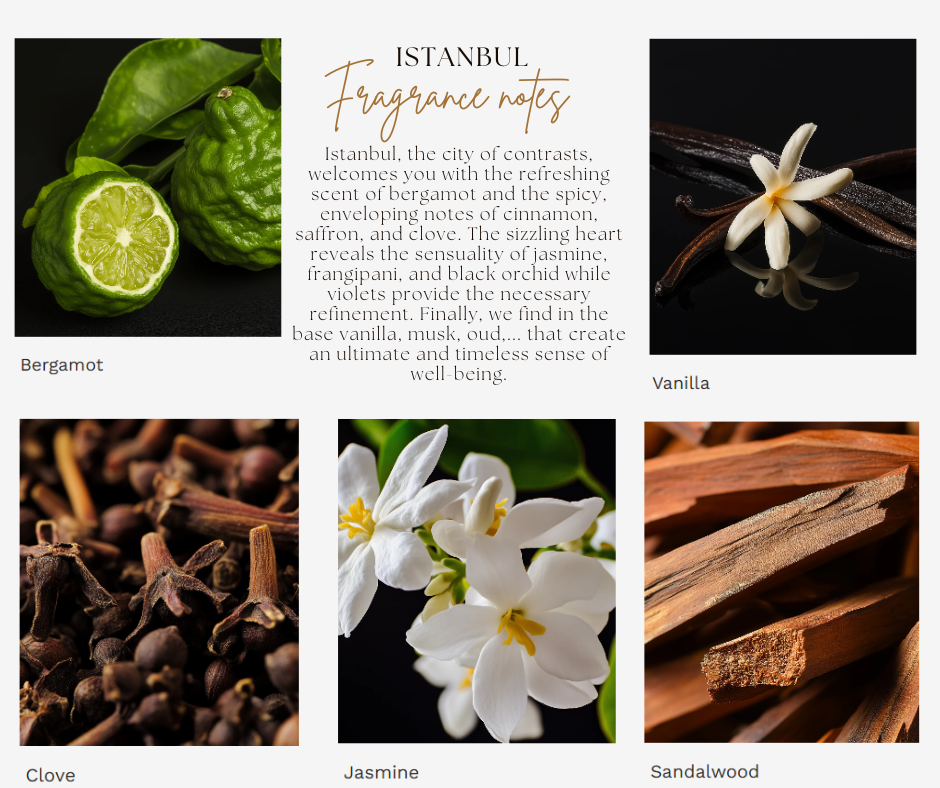 Istanbul, the city of contrasts, welcomes you with the refreshing scent of bergamot and the spicy, enveloping notes of cinnamon, saffron, and clove. The sizzling heart reveals the sensuality of jasmine, frangipani, and black orchid while violets provide the necessary refinement. Finally, we find in the base vanilla, musk, oud,... that create an ultimate and timeless sense of well-being.