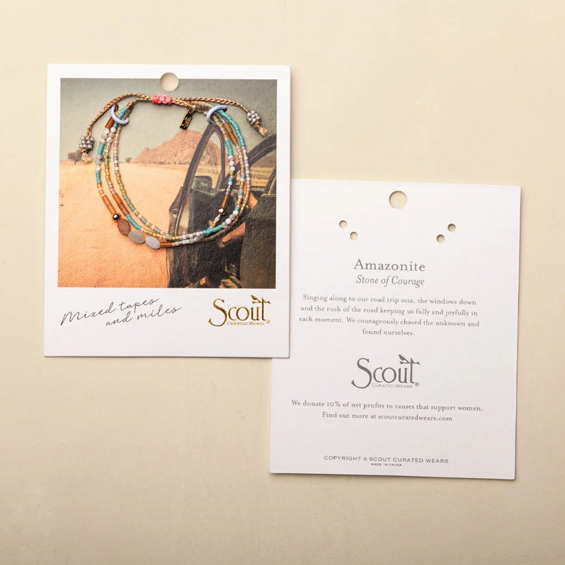 The semi-precious stone and its meaning are highlighted on the back on each card and connect to the photograph on the front of the card. Each playful stacking bracelet incorporates semi-precious stones along with Japanese glass Miyuki beads.