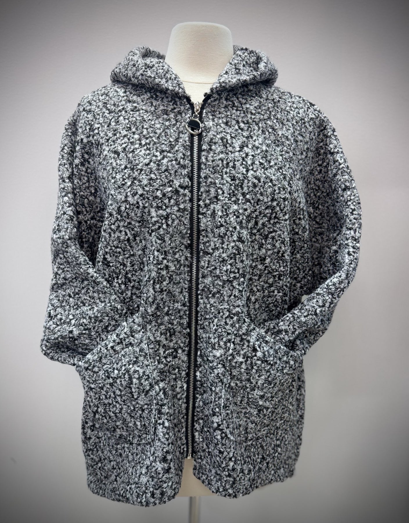 šŸ–¤šŸ¤TheĀ  Mallow Cardi Jacket by Me & Gee is cozy meets cool in the dreamiest way! Made from squishy-soft popcorn yarn in a black-and-white swirl that’s pure visual delight, this hooded zip-up brings major texture and charm. Front pockets for chilly hands or cute essentials? Check. A vibe that says ā€œsnug but make it fashionā€? Double check. It’s like wrapping up in your favorite blanket—if your blanket had serious street style. šŸŒ€šŸ§„āœØ