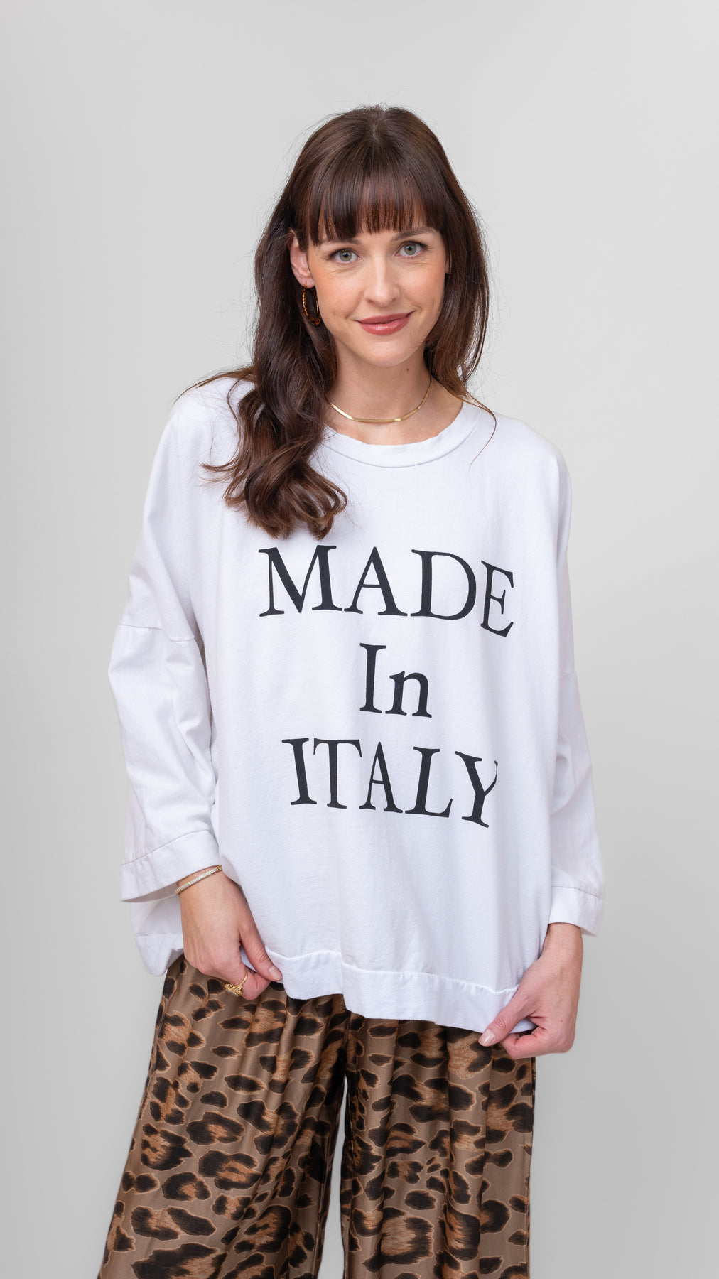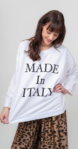 La Dolce Top 🍝✨ This oversized top is serving effortless Euro charm with its bold “MADE IN ITALY” statement! 🇮🇹 Made for coffee dates, market strolls, and daydreams of the Amalfi Coast, it's soft, slouchy, and totally sassy. Pair it with leopard print like this babe and you're basically a fashion movie star on vacation. 🎬💋