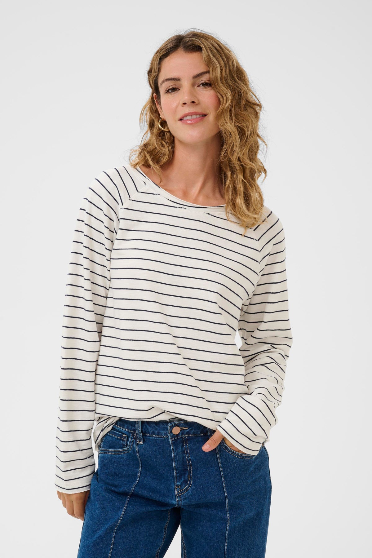 Designed in a classic Whisper Navy stripe on a soft ivory base, this long-sleeve top features a casual crew neckline, subtle raglan-style seams, and a flattering relaxed fit that drapes beautifully without feeling oversized. The lightweight cotton makes it perfect for layering or wearing on its own through every season.