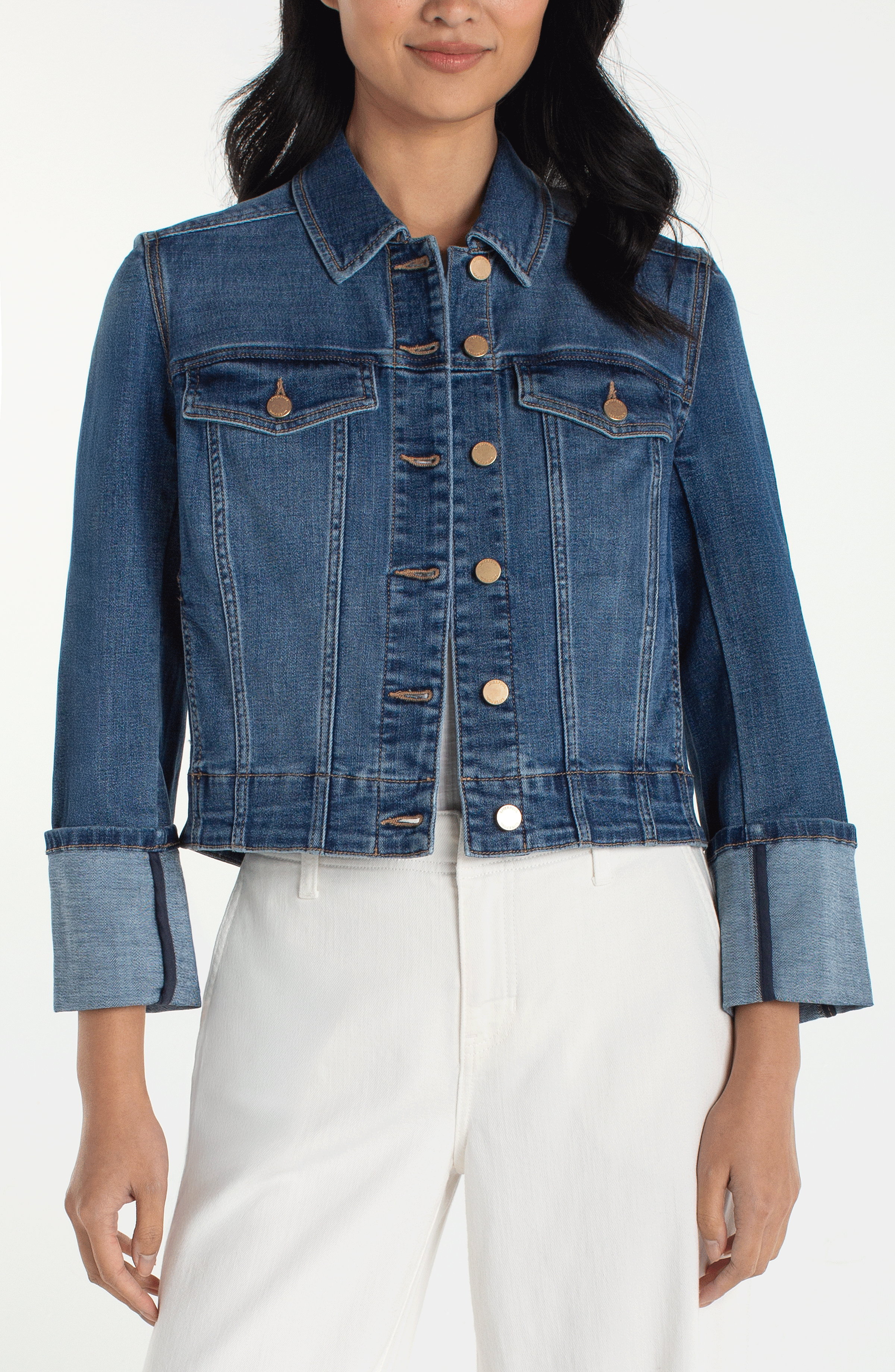 A modern take on the classic trucker jacket. Designed with a cropped silhouette, bracelet-length sleeves, and statement high cuffs for a structured, flattering look that layers effortlessly. This elevated denim piece pairs perfectly with dresses, denim, or tailored trousers.